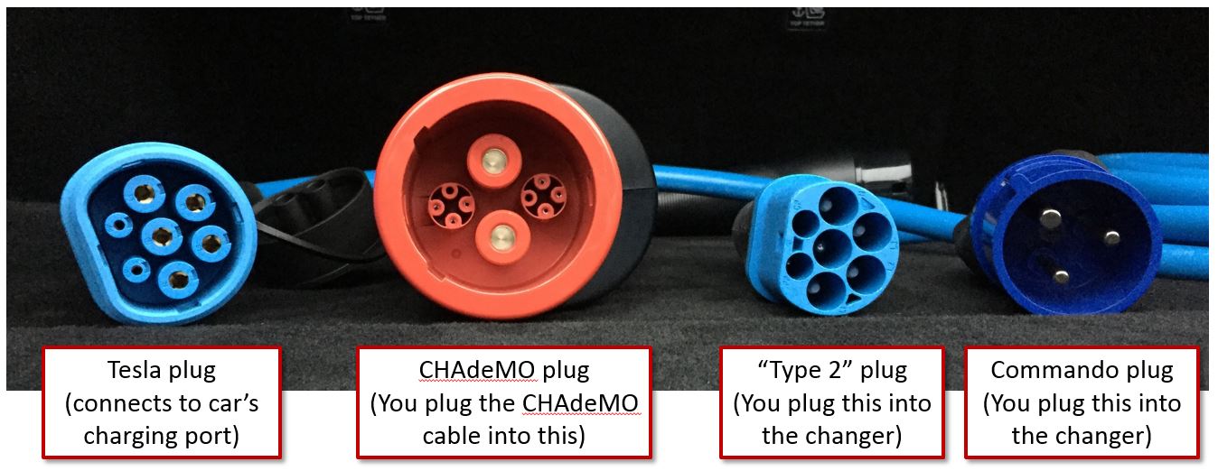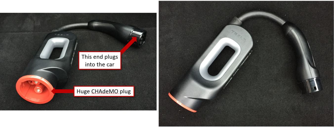 CHAdeMO chargers are important in the UK because [the green energy company] Ecotricity is building what it calls the “Electric Highway“ and in places like Scotland the rapid charger network is fantastic. There are a lot more of these chargers than there are Tesla superchargers and they cover a much wider area of the country. Bonus. The Ecotricity chargers (or “electricity pumps”, as they like to call them ???? ) have a whole bunch of connectors on them, one of which is a type 2 connector. However, this is a bit of a red herring, since this connector doesn’t deliver that much power. The one that you want for charging the Model S/X (unless you have a CCS adapter) is the CHAdeMO connector, which you’ll need an adaptor to connect to. (p.s. we rent them out to paid supporters if you’re doing a road trip). It looks like this: