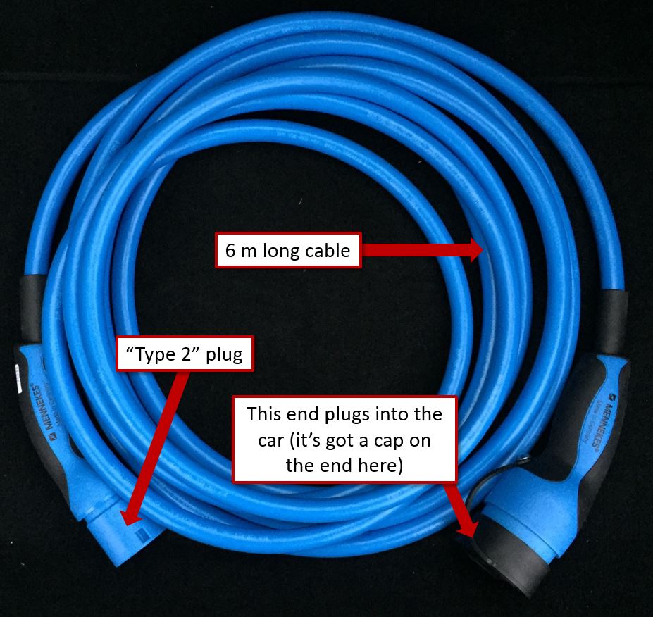 The type 2 plug is commonly found on slower chargers. Things like Chargemaster or PodPoint charge points, however, you also sometimes find these types of plug in things like shopping centre car parks, which can be helpful. Anyway, if you want to use this type of charging point, then you have to have another cable in the car. Ours looks like this: