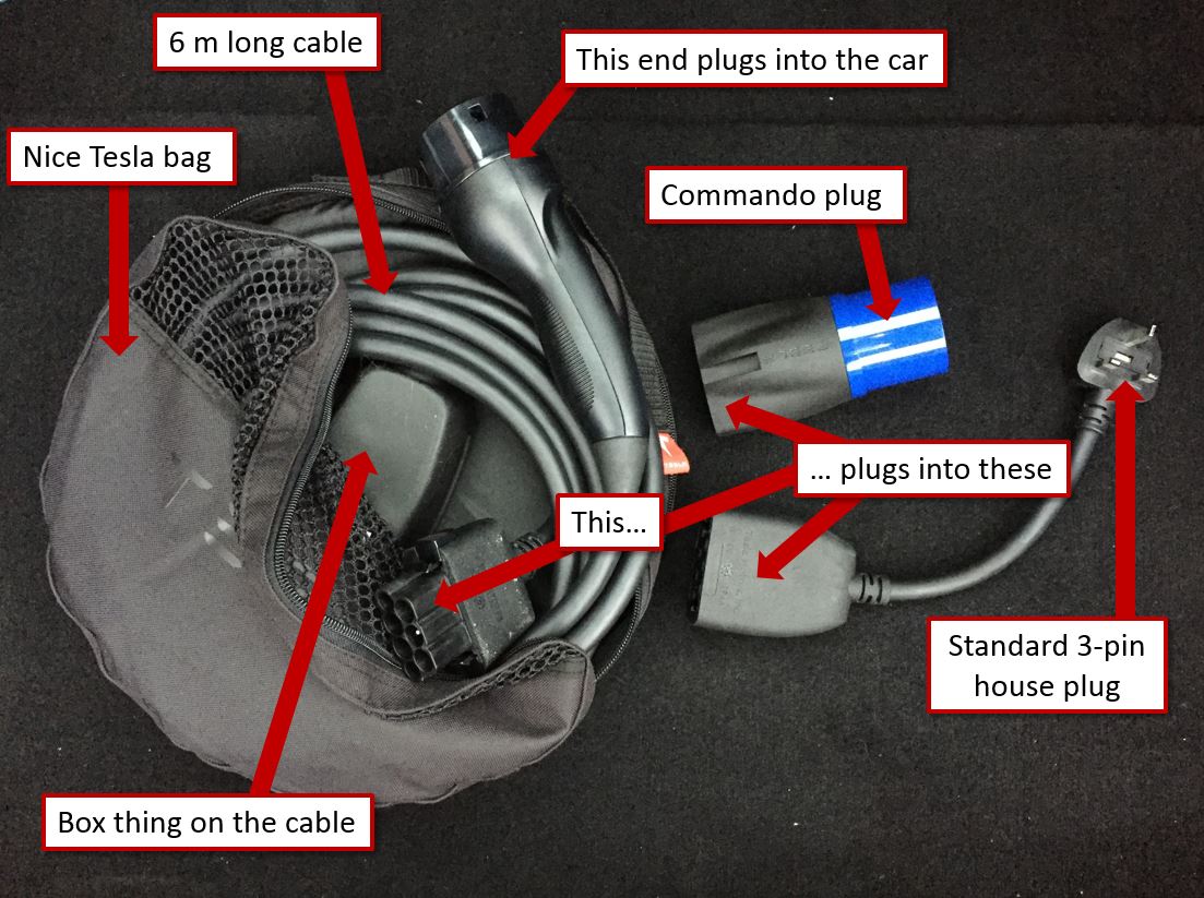 Note: this has slighly changed now but the fundamentals are still the same, to see the differences read: Tesla Mobile Connector (sometimes referred to as a UMC / Universal Mobile Connector) Explained including Gen 1 & Gen 2 differences Tesla gives you some adaptors to allow you to charge at home. This comes in a handy bag with all the bits in. It looks like this: