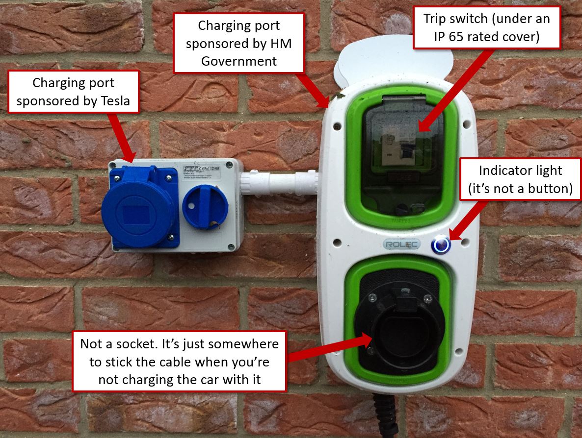 The one on the left is the a Commando 32amp lockable socket and the one on the right is the ROLEC one. Firstly, you’ll notice that we have both chargers. That’s because it turned out that it was cheaper to get both chargers installed than it was to get one installed. It seemed like a no-brainer to us. You can just seen the cable emerging from the bottom of the ROLEC charger. So, that’s the stuff that comes as standard. You can charge at home and you can supercharge.