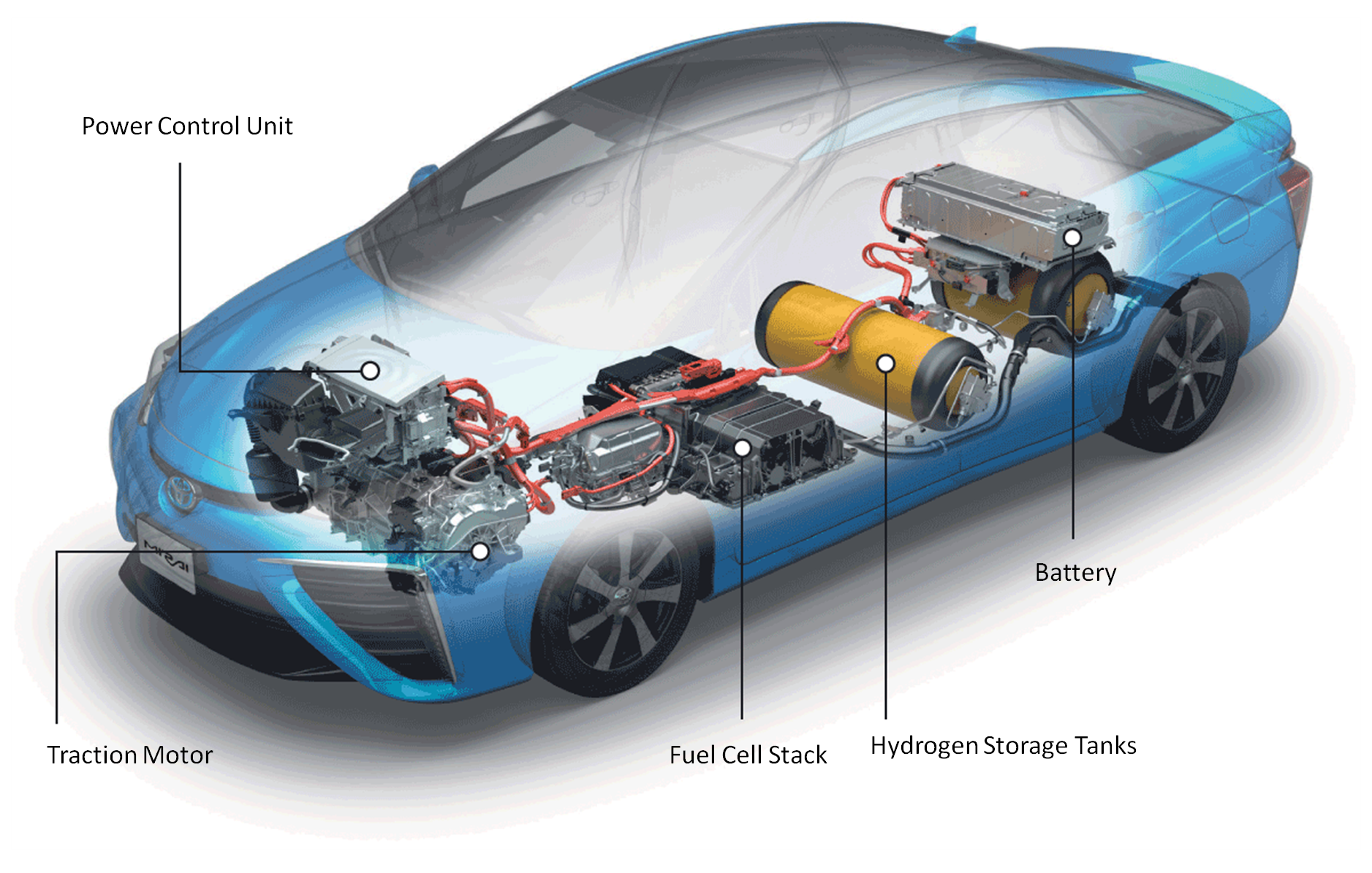 The above diagram shows the basic required components needed for a hydrogen powered car. Some components are shared with a Battery Electric Vehicle (BEV) such as battery, and traction motor, these are still required. Compressed hydrogen and oxygen from the atompshphere is fed into fuel cell where a reaction occurs which generates electricity, water and heat. This reaction happens at a fixed rate, this is used to charge the battery which acts as a buffer for the power used by the traction motor. [1]