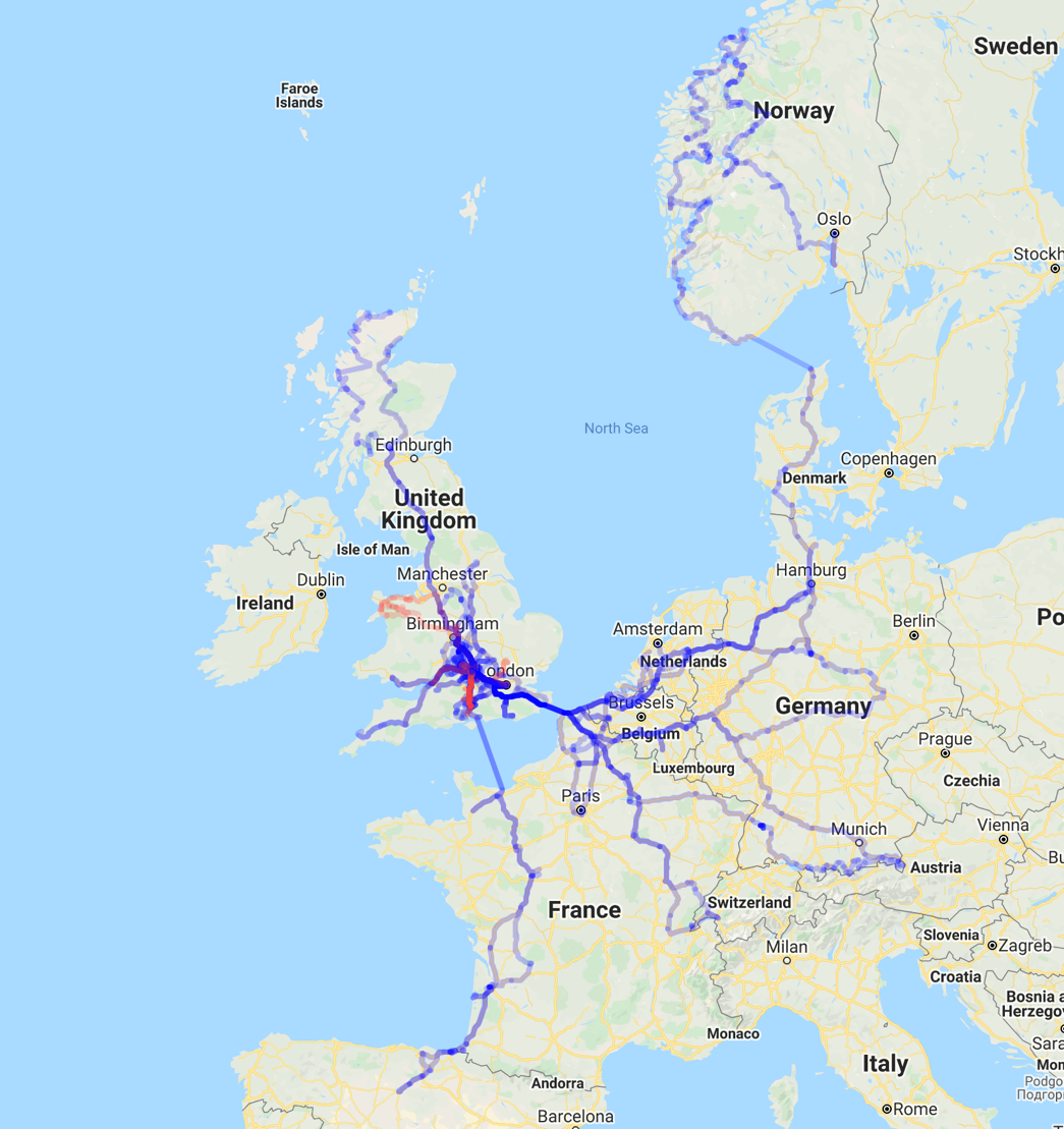 FUD: Electric cars can’t travel long distances Quite the opposite. One of the great pleasures of Tesla ownership is long-distance touring. The Tesla Owners’ Group has many members who regularly travel to the far corners of Europe – and who support others in planning their journeys too. Consider the map below, which shows the journeys taken by a Tesla driver in the first couple of years of ownership of a Model S. Highlights included a weekend “pop over to Leipzig” and a tour of Norwegian fjords. This is not an uncommon pattern with Tesla owners…