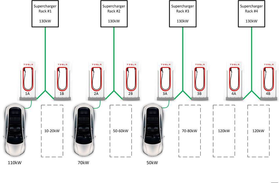 This only applies to super chargers with two cables attached (aka V2) Urinal etiquette at superchargers, basically superchargers are in pairs (e.g. 1A + 1B, 2A + 2B), a general rule of thumb is never plugin to a supercharger if another car is going to be immediately next to you. You will see stickers at the base of each supercharger showing their number and pair, if a car is plugged into 1A then don’t plugin to 1B if 2A or 2B is free. Priority is given to the first car that is plugged into a pair. If someone plugs into the pair you’re using your charge rate might be slightly reduced.
