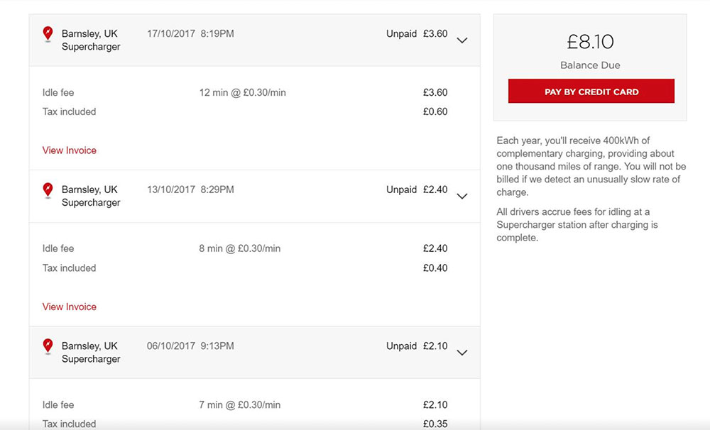 All charger locations are for charging and that is it, you should never park or leave a car in a charging bay if your car isn’t charging. To combat this, owners campaigned Tesla to start charging people once they’ve finished charging and if they’ve left their car. Idle fees automatically occur when your car has finished charging and hasn’t been moved. A customer would never leave a car parked by the pump at a petrol station and the same thinking applies with Superchargers. Idle fees will accrue if the car is not moved within five minutes after the charge session is complete and the station is at least 50% full. For every additional minute, a car remains blocking a Supercharger bay, it will incur a £0.30 idle fee, e.g. 10 minutes overstay = £3 charge. The Tesla mobile app notifies you both when charging nears completion and again when fully done. Additional notifications will alert you when idle fees are incurred. Learn more about Idle Fees.