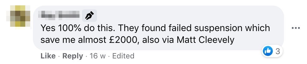 - Companies such as Cleevely Motors (other companies are available or via HEVRA) can do an ‘end of warranty check’ for £60+VAT at their HQ (slightly more for home visits, price correct as of June 2021, remember we have a list of discounts here for paid supporters including for Cleevely Service+MOT) but other garages should be able to do similar. These checks normally comprise of lifting the vehicle up and ensuring things like the suspension/brakes/wheels etc are all working as they should be, which isn’t something most owners are able/confident in doing.