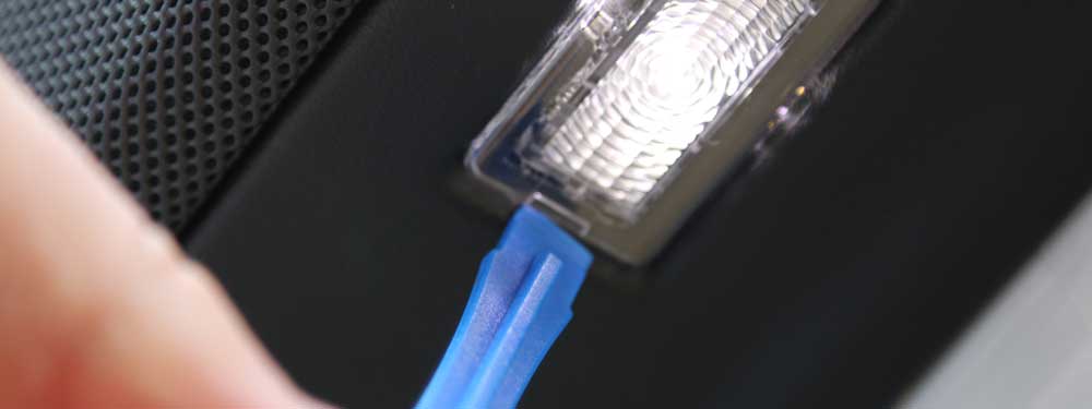 The cable has a clip which clips into the light enclosure to remove the wire push down with your finger nail (or pry tool) and pull the cable (gently) and it should pop out. Reverse the process for installing.