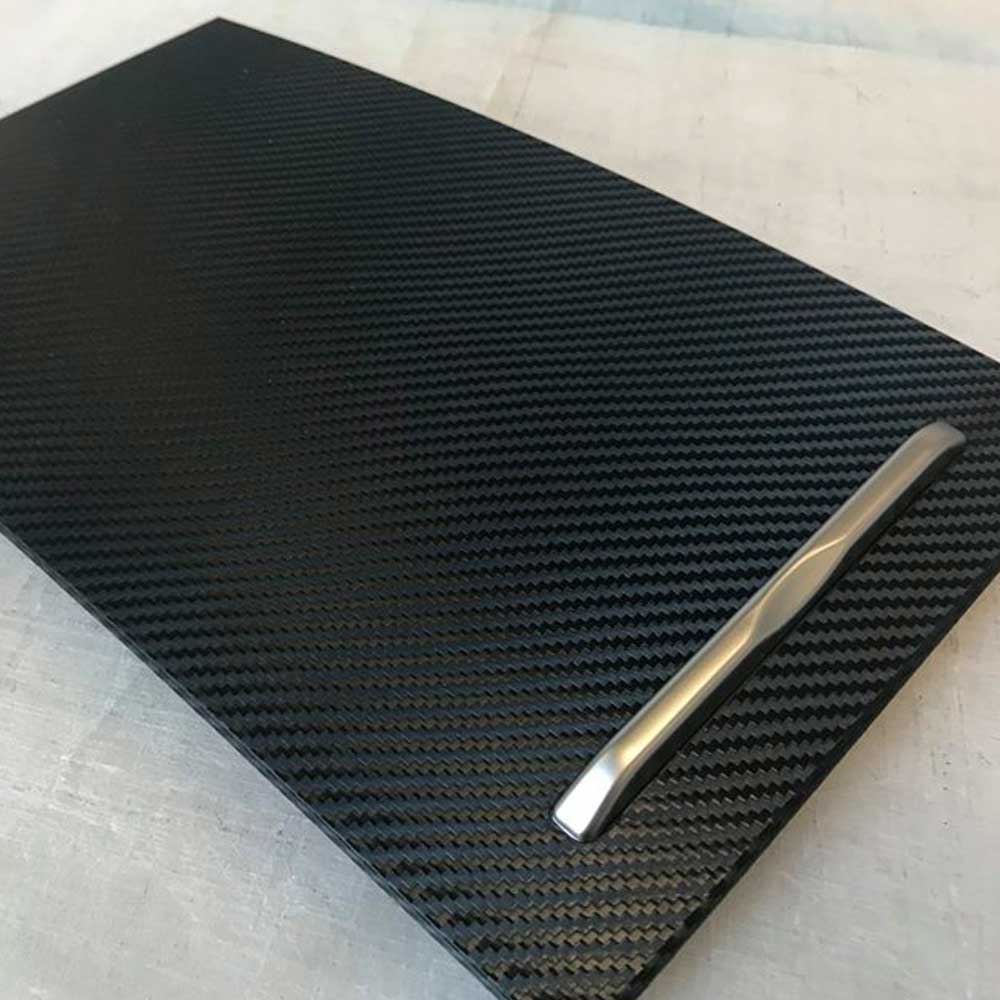 - Buy some 3M carbon fibre vinyl (3M DI-NOC carbon fibre Matt vinyl), make a paper template, cut oversized then hair drier & a bit of patience. All the panels pop off enough to tuck ends under (use these tools). Requires lots of time and effort but worth it in the end.
